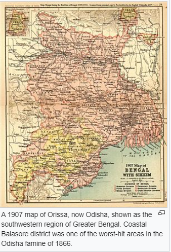 Orissa famine of 1866 ~ 1868 where Orissa, Bihar, Bellary and Ganjam district of Madras Presidency were affected. Death toll was one million in Orissa and about 5 million in the rest of the area.
