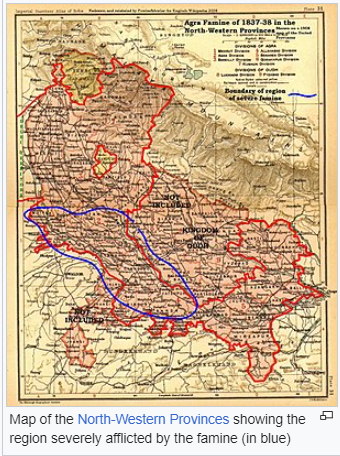 The Agra famine of 1837–1838 was a famine in the newly established North-Western Provinces of Company-ruled India that affected an area of 25,000 square miles (65,000 km2) and a population of 8 million people. The central Doab in present-day Uttar Pradesh was the most affected, with about a million deaths.