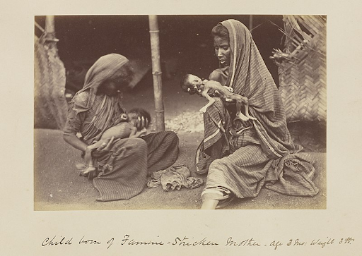 A photograph of a famine-stricken mother with a baby who at 3 months weighs 3 pounds. Photographer: W. W. Hooper. Great Famine of 1876–1878.